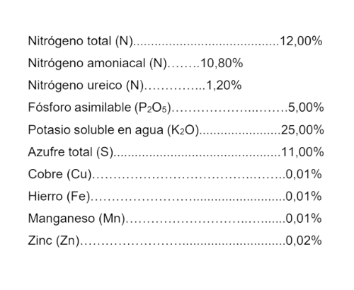 AGROFERCOL AGROPRODUCCIÓN 12-5-25 fertilizante foliar NPK que provee elementos secundarios y menores acompañados de agentes que permiten el desarrollo integral de las plantas. Su aplicación favorece la formación y transporte de azúcares y almidones, óptimo para las etapas de alta producción, cuaje, crecimiento acelerado y engrosamiento de fruto por su alto contenido de potasio.